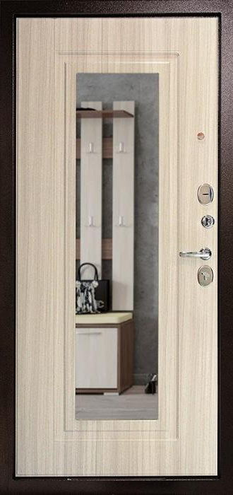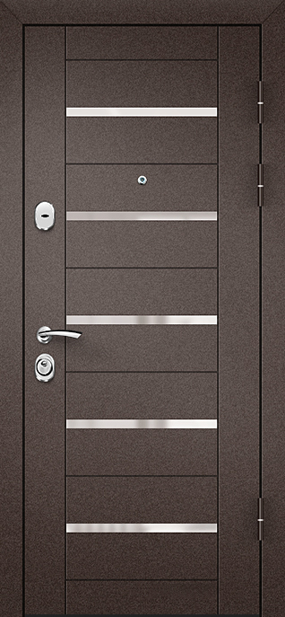 Прочный стальной каркас, лист металла толщиной 2 мм и система блокираторов делают эту модель надежным барьером для квартиры, офиса или частного дома. Внешняя поверхность покрыта молотковым напылением, устойчивым к механическим повреждениям и перепадам температуры, благодаря чему дверь сохраняет аккуратный вид долгие годы. Внутренняя накладка МДФ добавляет уюта и гармонично сочетается с интерьером прихожей. Зеркало на полотне выполняет не только декоративную функцию, но и делает пространство визуально шире. Зеленая входная дверь в квартиру №2 комплектуется двумя замками российских производителей — сувальдным Просам и цилиндровым Мосрентген, каждый из которых оснащён тремя ригелями. Два контура резинового уплотнения помогают минимизировать сквозняки и шум, а возможность выбрать сторону и тип открывания делает установку максимально удобной. При необходимости отделку, замки и дополнительные элементы можно адаптировать под индивидуальные требования. Зеленая входная дверь в квартиру №2 от производителя: быстрое изготовление и монтаж в Заокском, индивидуальные размеры, широкий выбор материалов и фурнитуры, официальная гарантия до 10 лет.
