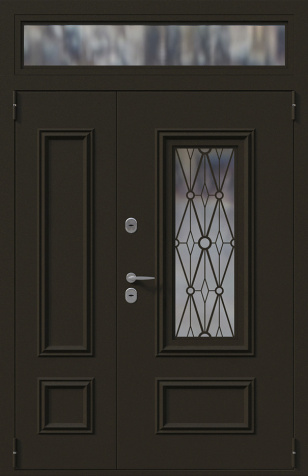 Дизайнерская входная дверь в частный дом с отделкой под дерево и решеткой №17