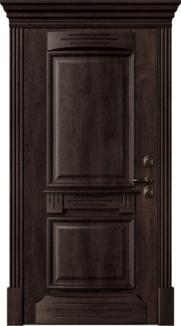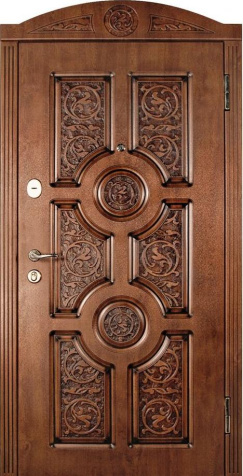 Дизайнерская входная дверь в частный дом с отделкой под дерево и решеткой №17